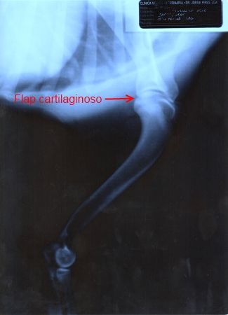 Mas o diagnóstico definitivo obteve-se por exploração radiológica. Fez-se uma projecção radiológica medio lateral com a articulação do ombro em extensão. Por se tratar de um animal muito dócil não foi necessário fazer uma sedação. De imediato pela projecção radiográfica se detectou um defeito radiolucido na metade caudal da cabeça do humero.